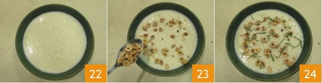 Now you can transfer the velouté to a deep dish 22, garnish the surface with toasted hazelnuts 23, add a bit of chopped sage, and a grind of pepper: your delicious celeriac velouté is ready to be enjoyed 24!