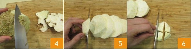 Now move on to the celeriac: wash it thoroughly under running water to remove soil residues, then remove the peel with the sharp blade of a knife 4 and cut it first into slices 5 and then into chunks about an inch thick 6. You should obtain approximately 2.5 lbs of cleaned celeriac.