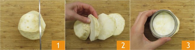 To prepare the celeriac with bagna cauda infusion, first wash and peel the celeriac, then remove imperfections with a paring knife. Cut the celeriac into slices 0.8-1 inch thick 1: you will need 4 uniform slices each weighing about 7 oz 2. Use a round cutter to shape the slices into a regular form 3.