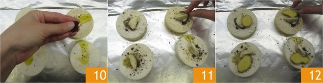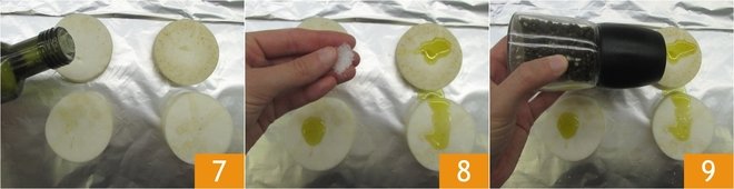 Place the celeriac discs on one of the aluminum sheets and generously season with oil 7, salt 8, and pepper 9.