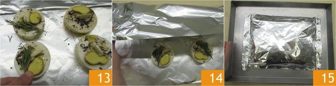 Finally, add aroma with a sprig of rosemary 13. Cover with the other sheet of aluminum foil 14 and seal all sides well, then transfer the parcel to a baking sheet 15. Bake in a fan oven preheated to 356°F for 15-20 minutes: note that once the parcel puffs up, it will take about ten minutes. Once cooked, remove the parcel from the oven and let it rest for 10 minutes.