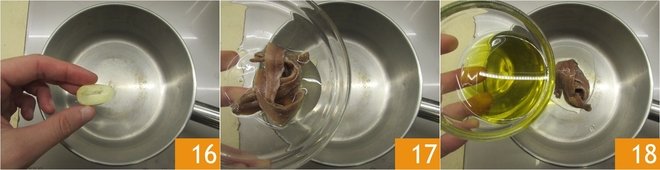 Meanwhile, prepare the bagna cauda: cut the garlic in half and remove the core, then place it in a saucepan 16 along with the anchovies 17 and the oil 18. Turn on the heat and simmer gently.