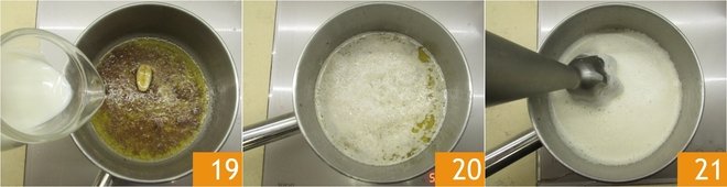 When the anchovies are not yet completely dissolved, pour in the milk at room temperature 19 and bring to a boil. From that moment, let it simmer for 7-8 minutes, stirring occasionally 20, then blend with an immersion blender 21.