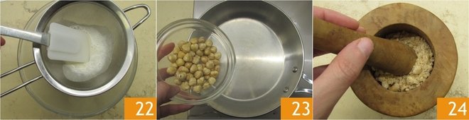 Finally, strain the mixture through a sieve 22 and pour it back into the saucepan to keep it warm. Place the hazelnuts in a pan, turn on the heat, and toast them for 4-5 minutes 23. Coarsely crush the hazelnuts with a pestle or a meat tenderizer, adding a pinch of salt 24.