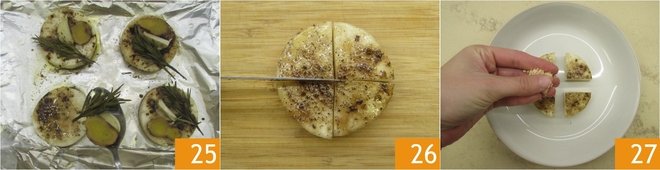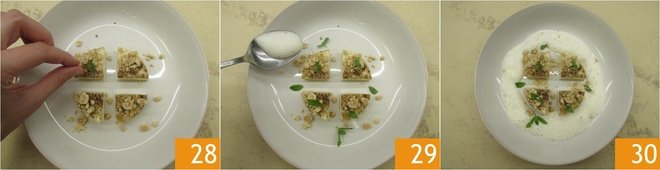 After the resting time, open the parcel, being careful not to burn yourself with the steam, remove the seasonings 25, and check the cooking with a toothpick: the texture should be tender. Cut the celeriac slices into 4 parts 26 and garnish with the crushed hazelnuts 27.
