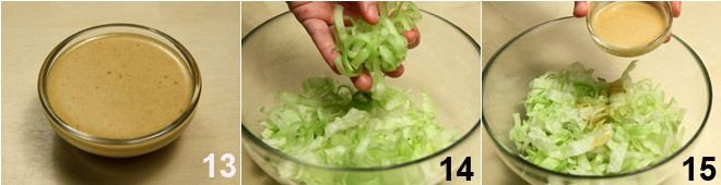 Pour the dressing into a small bowl and set it aside 13. Mix the strips of lettuce and celery in a salad bowl 14, season with part of the dressing, and mix well 15.