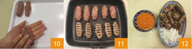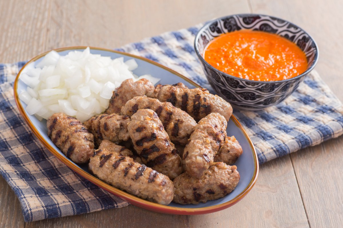 After this time, take the mixture and form cylindrical meatballs about 4 inches long and 0.75 inches wide, working it between the palms of your hands 10. Meanwhile, heat a grill. Once formed, cook the cevapcici on the grill for about 7 minutes, turning them often to ensure even cooking 11: they should be charred on the outside but still soft and juicy on the inside. Serve the cevapcici hot or warm, perhaps accompanied by raw onions and ajvar sauce as tradition suggests 12!