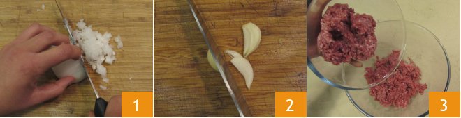 To make the cevapcici, first peel and finely chop the onion 1 and garlic 2, then place the 3 types of minced meat in a large bowl 3.
