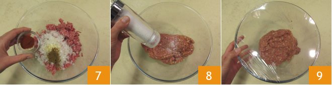 Also add the paprika 7 and mix with your hands to obtain a homogeneous mixture, then season with salt 8 and pepper and mix again. Cover the bowl with cling film 9 and leave in the refrigerator for at least 2 hours to allow the flavors to blend.