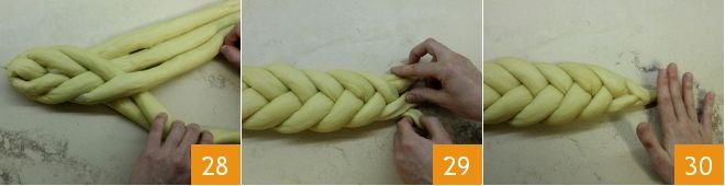 Continue in this way 28 until you finish the dough 29 and slightly roll the end 30, before folding it under the challah.