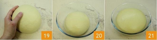 Form a ball with the obtained dough 19 and transfer it to a bowl 20 to let it rise covered with plastic wrap in a turned-off oven with the light on for at least 3 hours. After the necessary time, the dough will have doubled in volume 21.