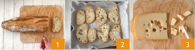 To prepare the cheese crostini, first cut the bread into slices about 0.6 inches thick 1. Place the slices of bread on a baking sheet lined with parchment paper and spread them with butter 2, then toast them in a preheated static oven at 392°F for about 4 minutes. Meanwhile, cut both the Edam and Emmental into cubes 3.