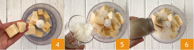 Pour the cheese into a food processor 4, then add the grated Grana Padano PDO 5 and the pepper 6.