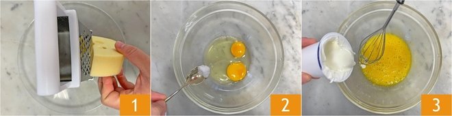To make the cheese muffins, first grate the Emmental with a coarse grater 1 and set it aside. In a bowl, pour the eggs and salt 2, then beat with a hand whisk and add the yogurt 3.