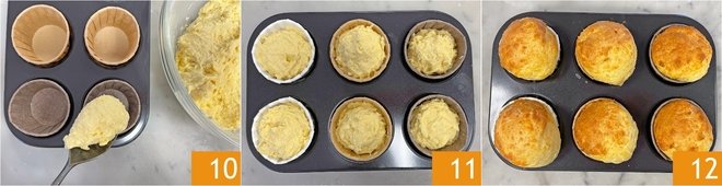 Divide the batter into 6 muffin liners placed inside a muffin tin 10 and bake in a preheated convection oven at 350°F for about 20 minutes 11. Once cooked, your cheese muffins are ready to be served 12!