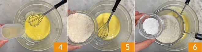 Mix again, then also add the vegetable oil 4 and grated Parmigiano Reggiano PDO 5 and mix everything well. Now sift the flour and baking powder into the bowl 6.