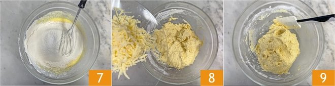 Incorporate the dry ingredients with the whisk 7, then add the grated Emmental 8 and mix with a spatula to obtain a homogeneous batter 9.
