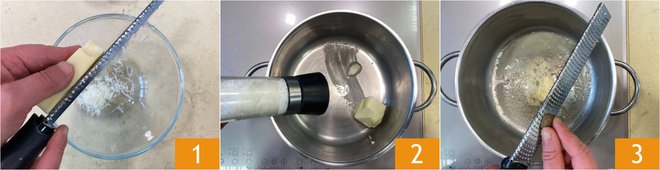 To prepare the cheese soufflé, first grate the Parmesan and the Gruyere 1. In a pan, melt the butter, add salt and pepper 2. Add the nutmeg 3.