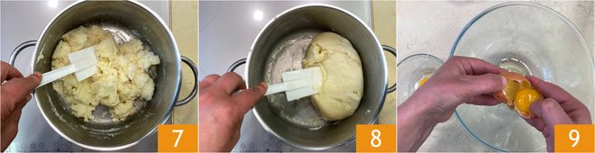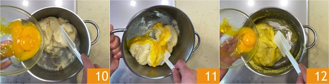 Add two yolks first 10, stir to mix 11, and finally add the last yolk 12. Stir again and let it cool completely.