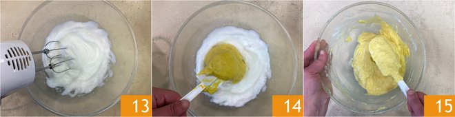 In the meantime, start beating the egg whites and stop when they are semi-whipped 13. Add a portion of the cheese mixture and stir 14, then add the rest of the mixture and gently fold from bottom to top 15.