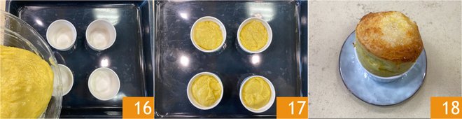 Pour everything into the ramekins with a base diameter of 3 inches, 3.5 inches at the top, and a height of 2 inches, previously buttered 16 and sprinkled with grated Parmesan 17. Bake in a preheated static oven at 320°F for 10 minutes, then, without opening the oven, increase the temperature to 390°F in fan mode, and continue baking for another 10 minutes. Remove from the oven and serve the cheese soufflé immediately 18.