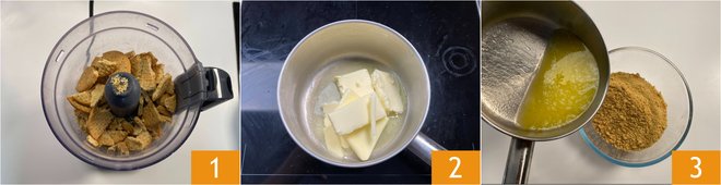 To prepare the cheesecake pastiera, start with the base: blend the dry cookies in a mixer 1 until you get a sandy texture. Melt the butter in a saucepan over low heat 2 and let it cool slightly. Then combine the pulverized cookies with the melted butter 3.
