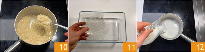In the end, the mixture should be creamy and almost dry 10, keep it aside and let it cool while you continue with the preparations. Soak the gelatin sheets in cold water for 10 minutes 11. Then heat the milk 12 until it almost boils.