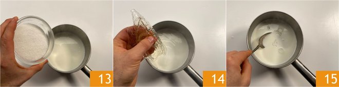 Remove the saucepan from the heat and add the sugar 13 and the drained and squeezed gelatin 14. Stir immediately to dissolve the gelatin well 15. Let it cool slightly.