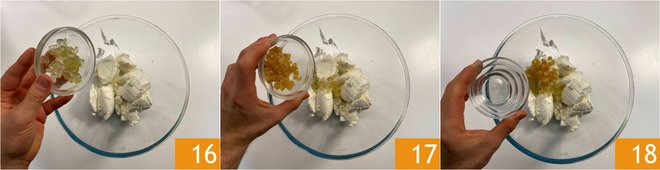 Meanwhile, in a bowl, add the ricotta, cream cheese, candied citron 16, and orange 17, scent with orange blossom water 18.
