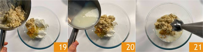 Add the now cold wheat 19 and the milk with sugar and gelatin 20. Blend well with an immersion blender 21.