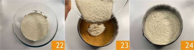 You will get a slightly grainy mixture 22, transfer it inside the mold 23 and tap it on the work surface to distribute the cream well 24. Then put it back in the fridge for at least 4-5 hours.