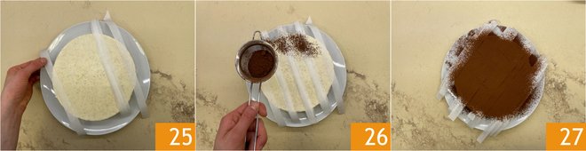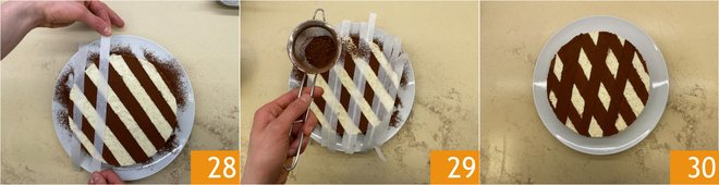 Once set and unmolded, place 4 strips of parchment paper about 0.6 inches wide on the cheesecake 25. Dust the surface with unsweetened cocoa 26 27 and then gently lift the strips to remove them.