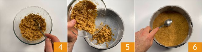 Mix to obtain a homogeneous mixture 4. Line a 8-inch springform pan with parchment paper. Pour the cookie mixture here 5 and press with the back of a spoon to distribute it evenly across the entire base of the pan 6. Now place in the refrigerator to set and continue with the preparation.