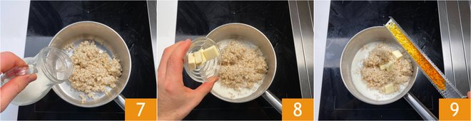 Pour the precooked wheat into a saucepan together with the milk 7, the butter 8, and the grated zest of orange and lemon 9. Add a pinch of salt and cook for about ten minutes, stirring often.