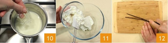 and add them to the heated cream 10, stirring to dissolve the gelatin completely. While the cream cools, prepare the cheese cream: in a bowl, pour the cream cheese and ricotta 11. Then slit a vanilla bean 12 and extract the seeds with the tip of a knife.