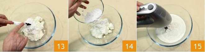 Add them to the cheeses 13, then add the remaining fresh liquid cream, the powdered sugar 14, and the cream in which you dissolved the gelatin sheets, now lukewarm. Work the cream with electric whisks 15.