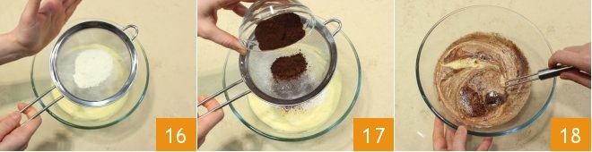Sift the potato starch 16, flour, baking powder, and unsweetened cocoa powder 17 into the bowl. Then mix 18 to make the cream smooth.