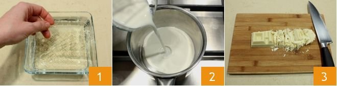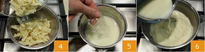 and melt it in a double boiler 4. When the cream and milk are hot, drain and squeeze the gelatin sheets carefully and dissolve them inside 5, stirring with a whisk to avoid lumps. Turn off the heat and let it cool; at this point, you can pour this liquid in which you dissolved the gelatin over the now melted white chocolate 6;