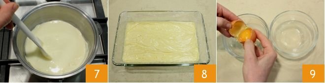 stir with a wooden spoon to combine the two mixtures 7. Pour the cream into a wide and shallow bowl and cover it with plastic wrap in contact 8; put it in the refrigerator to set for at least 2 hours. In the meantime, prepare the sponge cake: separate the egg yolks from the whites 9