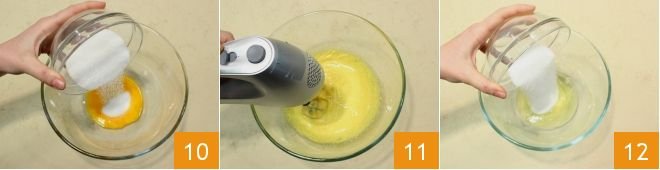and pour the yolks into a large bowl: beat them with the honey, then add half the sugar 10. Work the yolks and sugar with electric whisks 11 until they are light and frothy. Then proceed in the same way for the egg whites: pour them into a large bowl, add a pinch of salt and the other half of the sugar 12