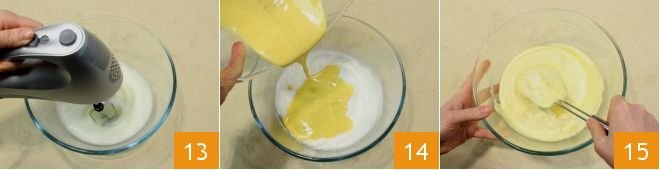 and whip them 13 until creamy (make sure you have cleaned the whisks of any traces of yolks and sugar before working the egg whites). Pour the yolks gently over the whipped egg whites 14 and fold the two mixtures with a spatula in upward motions to prevent them from deflating 15.