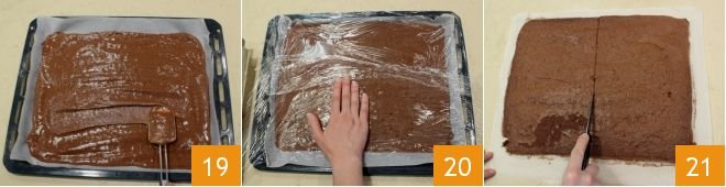 Line a baking sheet with parchment paper (you can lightly butter the baking sheet so that the parchment paper adheres better), spread the mixture evenly over the sheet 19, and bake it in a preheated static oven at 390°F for 6-7 minutes (if a fan oven at 355°F for 4-5 minutes). Once baked, take it out and cover it immediately with plastic wrap 20, to prevent the sponge cake from drying out on the surface as it cools. While the sponge cake cools, take the white chocolate cream and work it with whisks for a few moments to soften it. Then remove the plastic wrap from the now cooled sponge cake, cut it into two rectangles 21