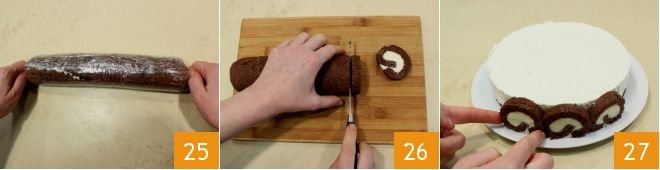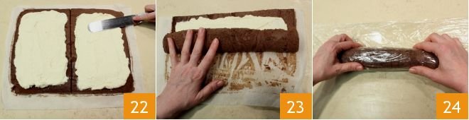 and fill both with the cream, using a spatula 22 or the back of a spoon. Roll up both rectangles from one of the longer sides 23 and compact them well with your hands. Roll each roll with plastic wrap 24