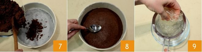 Pour the mixture into a 9-inch cake pan lined with parchment paper 7 and distribute it on the bottom compacting it with the back of a spoon 8. You can store the base in the refrigerator for at least half an hour to set. In the meantime, prepare the filling: heat 50 ml of heavy cream in a saucepan; then drain and squeeze the gelatin sheets carefully 9