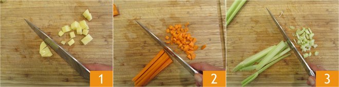 To make the cheesy vegetable pie, first clean and cut the potatoes into cubes of about 1 cm 1. Cut the carrots 2 and celery 3 into cubes of about 1/2 cm.