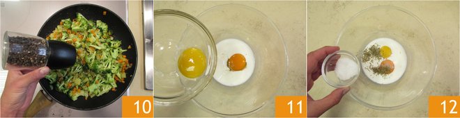 Stir, salt, and pepper 10. Cook over high heat for about 5 minutes. Turn off the heat and set aside. In a bowl, pour the milk, egg, yolk 11, aromatic herbs, salt 12.