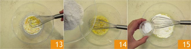 Mix with a whisk 13. Incorporate the flour 14 and the baking powder 15.