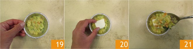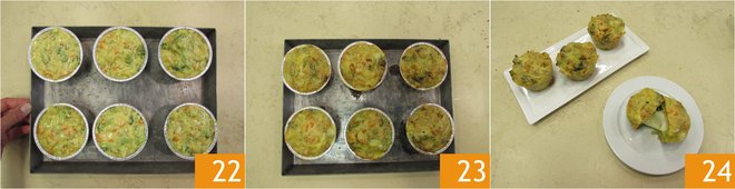 Place the molds on a tray 22 and bake in a preheated static oven at 350°F for 30/35 minutes until the surface is golden. Remove from the oven 23 and unmold the cheesy vegetable pie while still hot 24.
