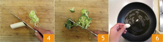 Thinly slice the leek 4. Cut the broccoli into pieces 5. Pour a drizzle of oil into a large pan. Add the garlic clove and let it sauté over high heat for about 2 minutes.