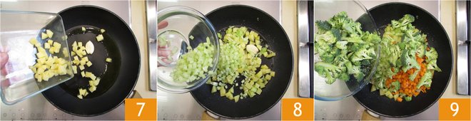 Then add the cubed potatoes 7 and the sliced leek. Let cook over low heat for about 5 minutes. Add all the chopped vegetables to the pan 8 9.